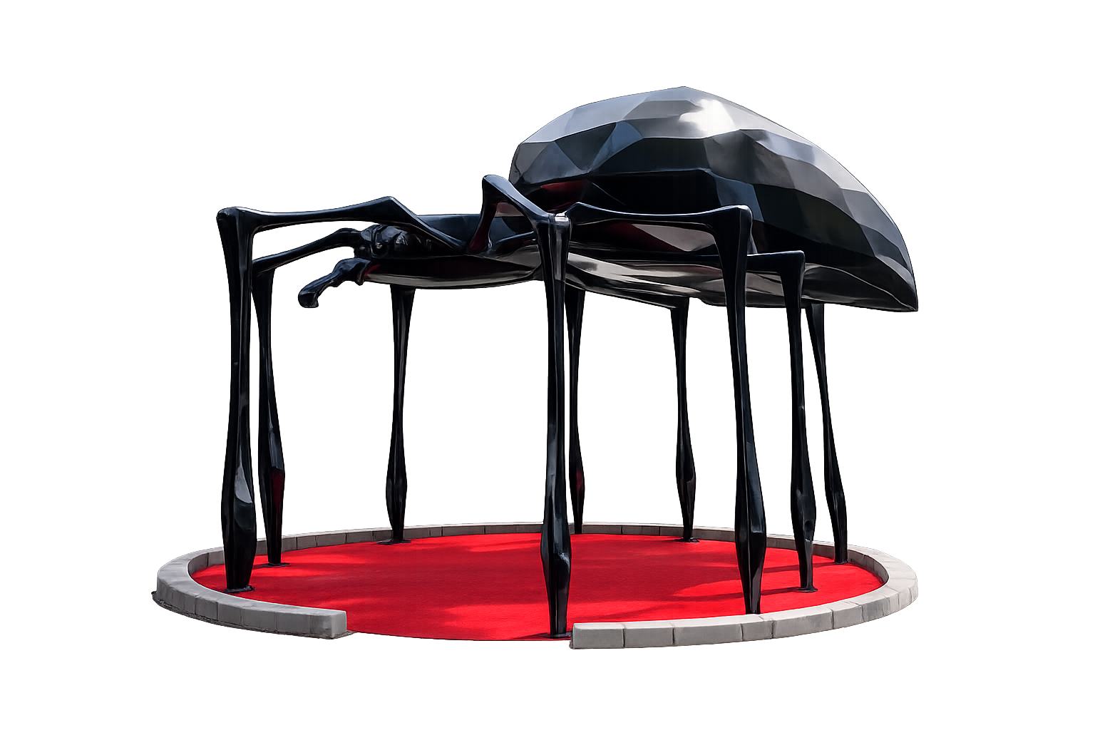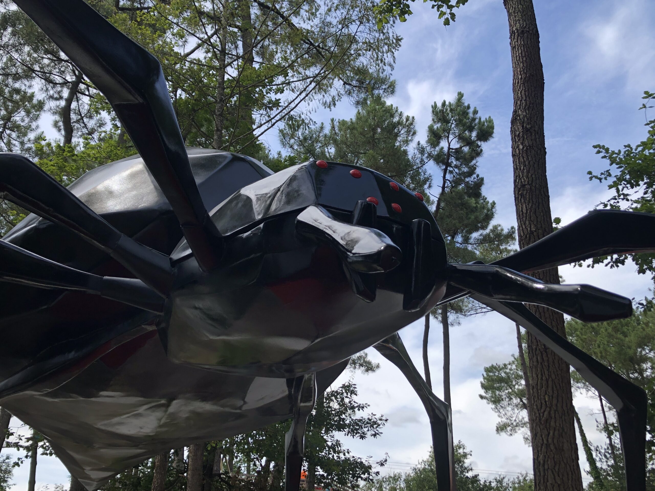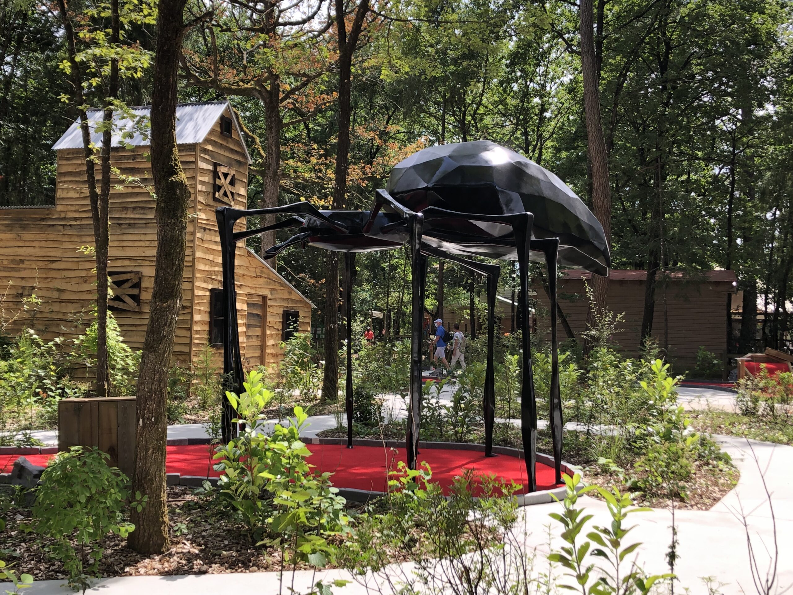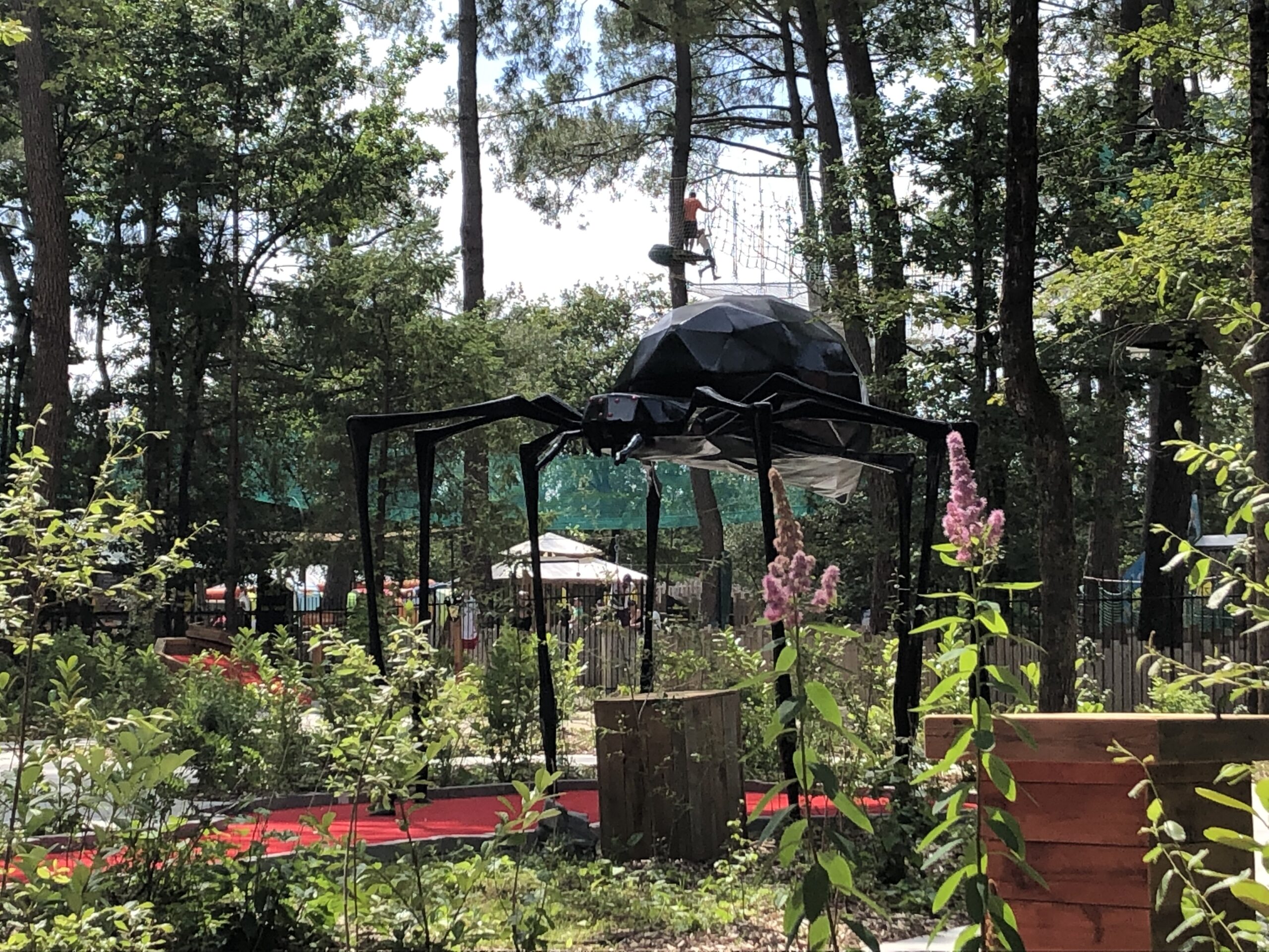 Araignée géante installée au cœur d’un parcours de mini-golf. Elle sert de décor central et attire immédiatement le regard.