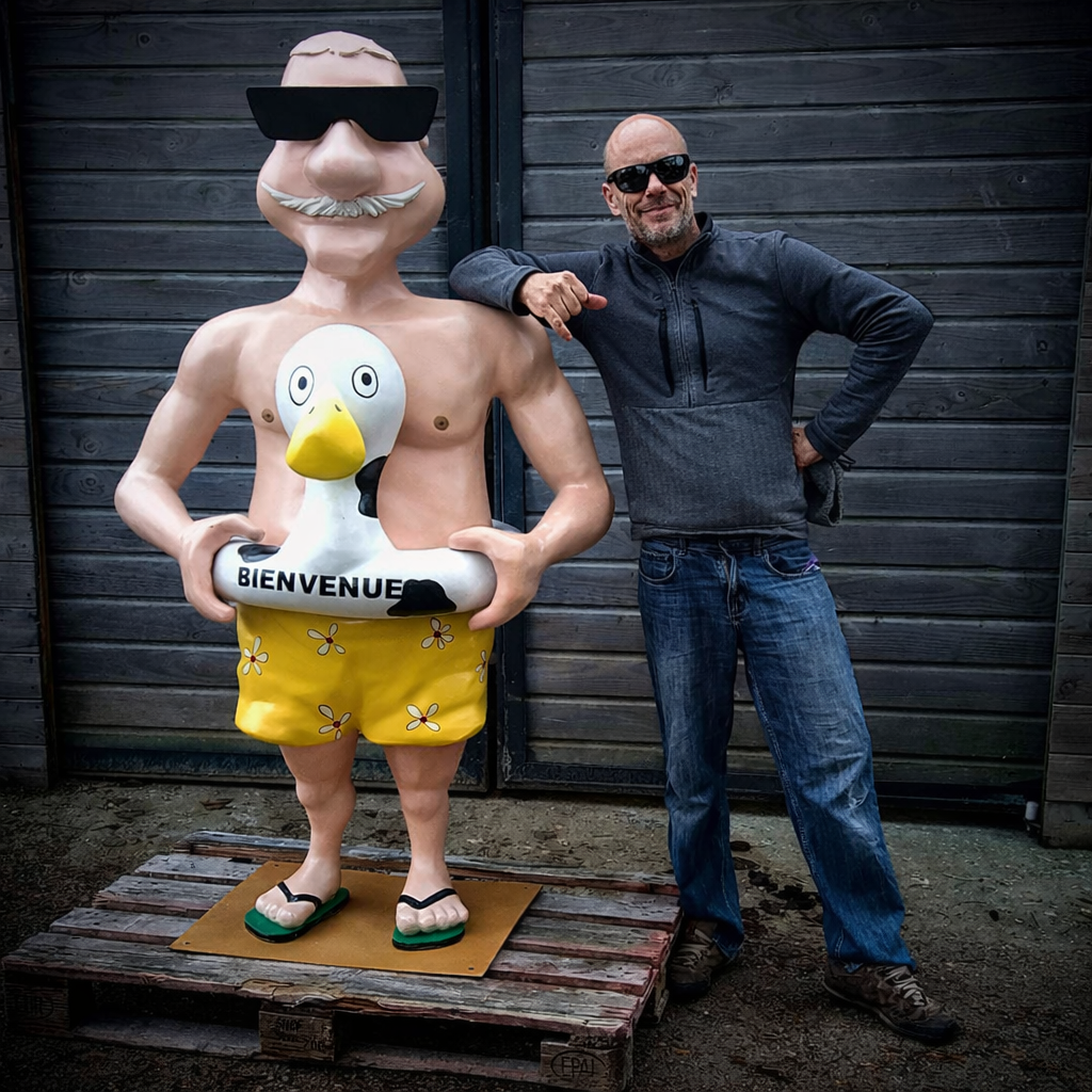 Avec son style décontracté, ses lunettes de soleil et sa bouée pleine d’humour, ce Papi-nageur accueille les visiteurs à l’entrée de la piscine avec chaleur et bonne humeur. Réalisée en résine et pensée pour l’extérieur, cette sculpture attire immédiatement le regard et crée une atmosphère conviviale dès les premiers pas. À la fois drôle et rassurante, elle incarne l’esprit familial du lieu et invite petits et grands à entrer dans un univers de détente et de plaisir. Une mascotte attachante qui donne le ton avant même le premier plongeon.