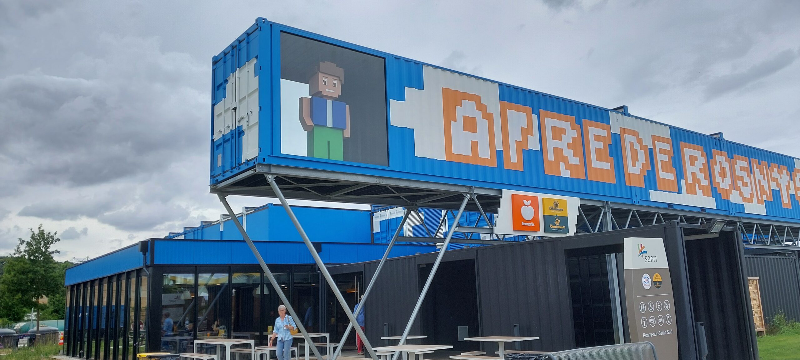 Personnage pixel art installé en hauteur sur une aire d’autoroute, ce bonhomme inspiré de l’univers des jeux vidéo attire immédiatement l’attention.
